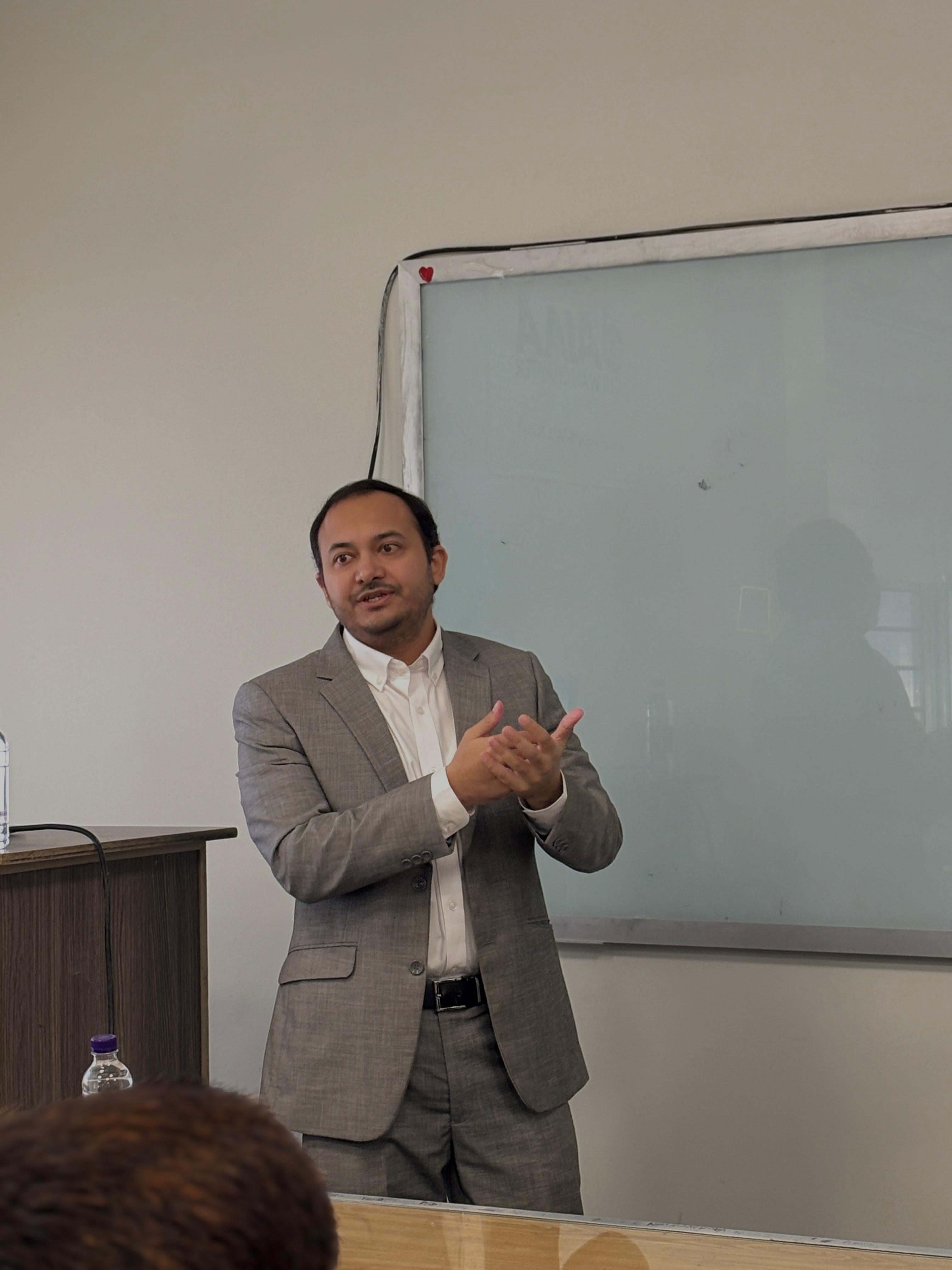 The guest speaker delivered an engaging and practical talk covering Erasmus+ opportunities for students and faculty, including International Credit Mobility, Erasmus Mundus Joint Master Degrees, and Capacity Building Grants. He shared key insights on proposal writing, partnership development, academic visibility, and strategies for building competitive international profiles.
