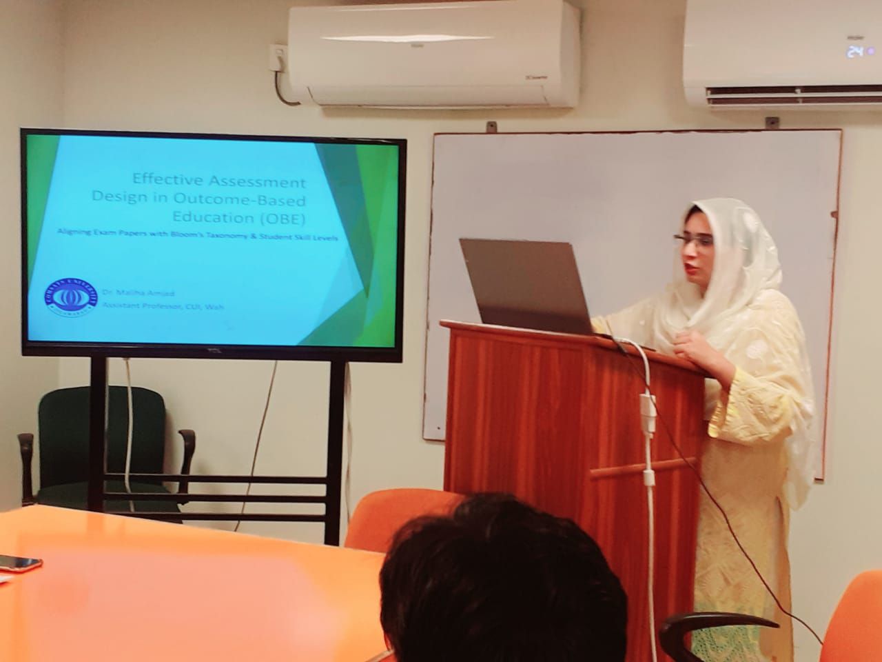 The Department of Computer Engineering, COMSATS University Islamabad, Wah Campus, organized a faculty training session on “Effective Assessment Design in Outcome-Based Education (OBE)” on October 15, 2025, in the ECE Conference Room. The session, conducted by Dr. Maliha Amjad, focused on developing outcome-aligned assessment strategies within the OBE framework.