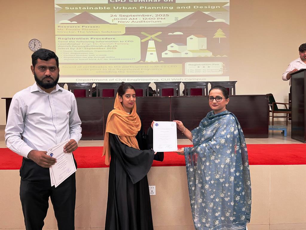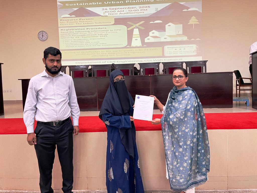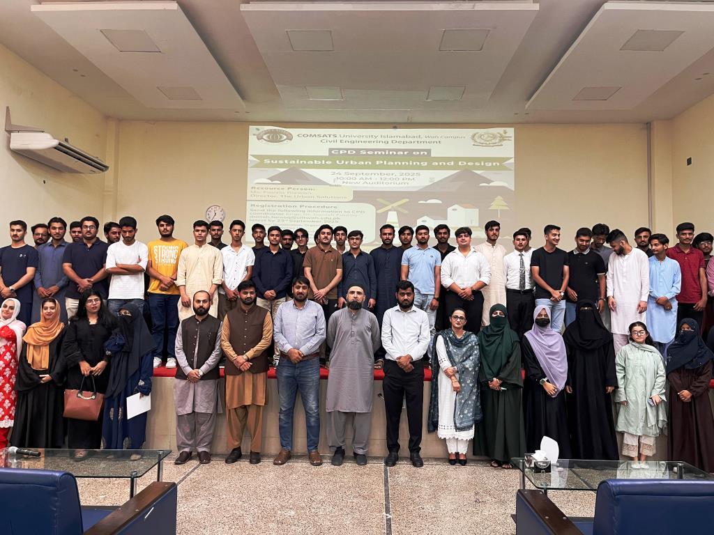 The Department of Civil Engineering organized a CPD seminar on “Sustainable Urban Planning and Design” on September 24, 2025, at CUI Wah Campus. Dr. Hassan Ashraf, HoD Civil Engineering, welcomed the guest speaker, Ms. Fauzia Rizwan, Managing Director of The Urban Solutions Pvt. Ltd., who brings extensive experience from NESPAK and holds an MS in Urban and Regional Planning from NUST.