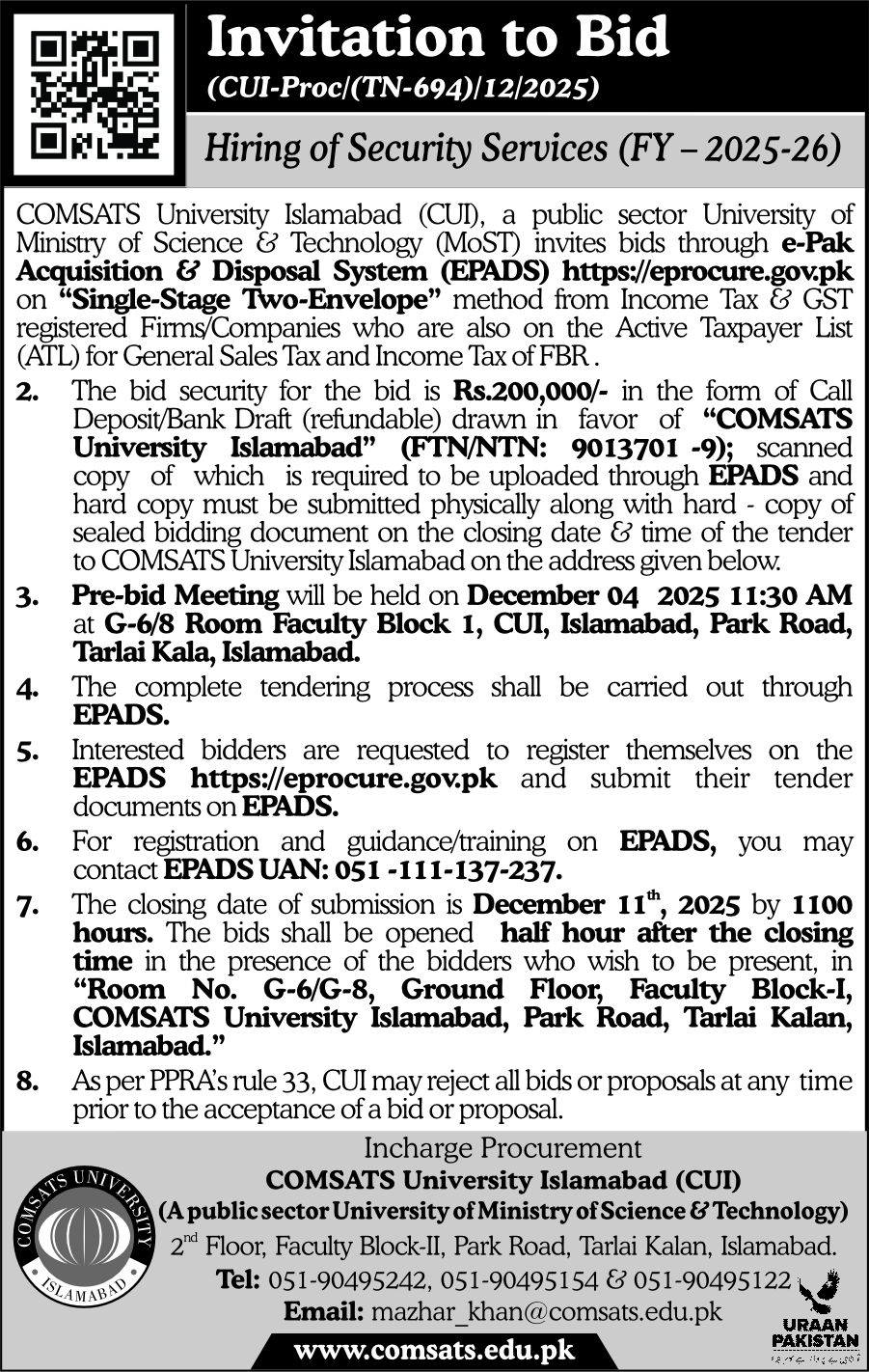 Invitation to Bid for Hiring of Security Services (FY – 2025-26) at CUI Islamabad Campus