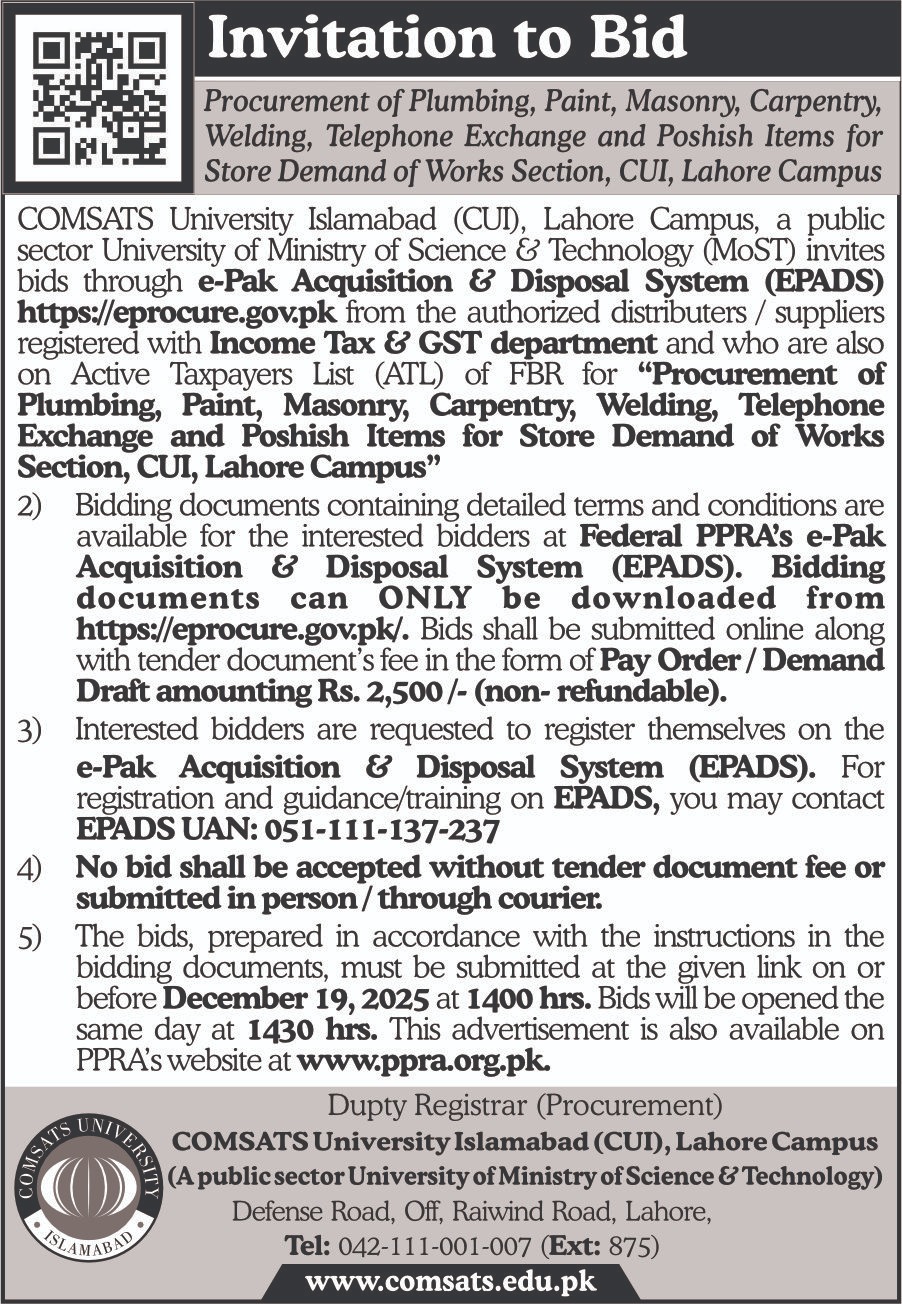 Invitation to Bid for Procurement of Plumbing, Paint, Masonry, Carpentry, Welding, Telephone Exchange and Poshish Items CUI Lahore Campus