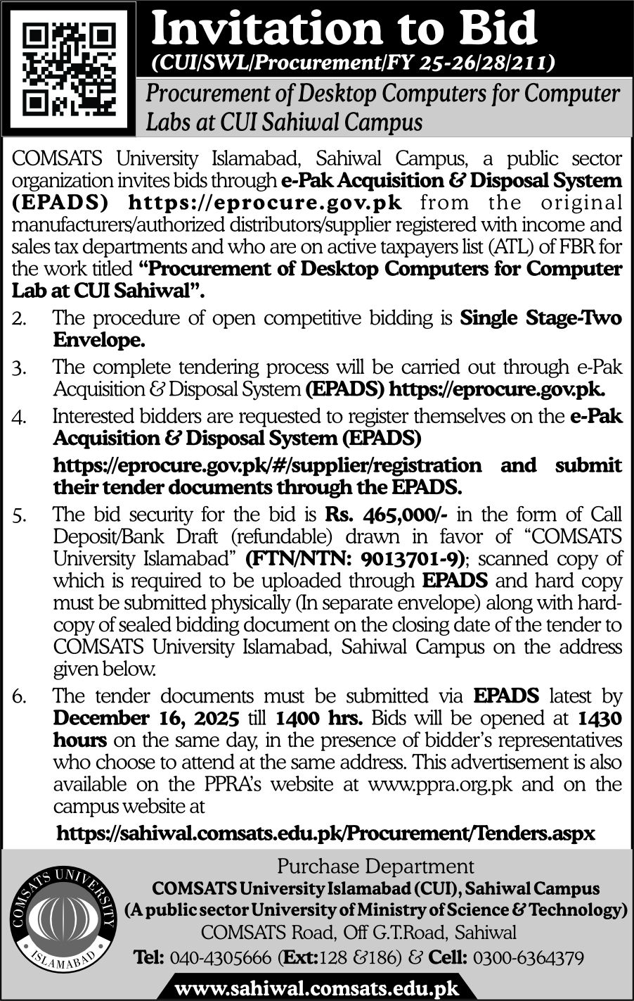 Invitation to Bid for Procurement of Desktop Computers for Computer Labs at CUI Sahiwal Campus