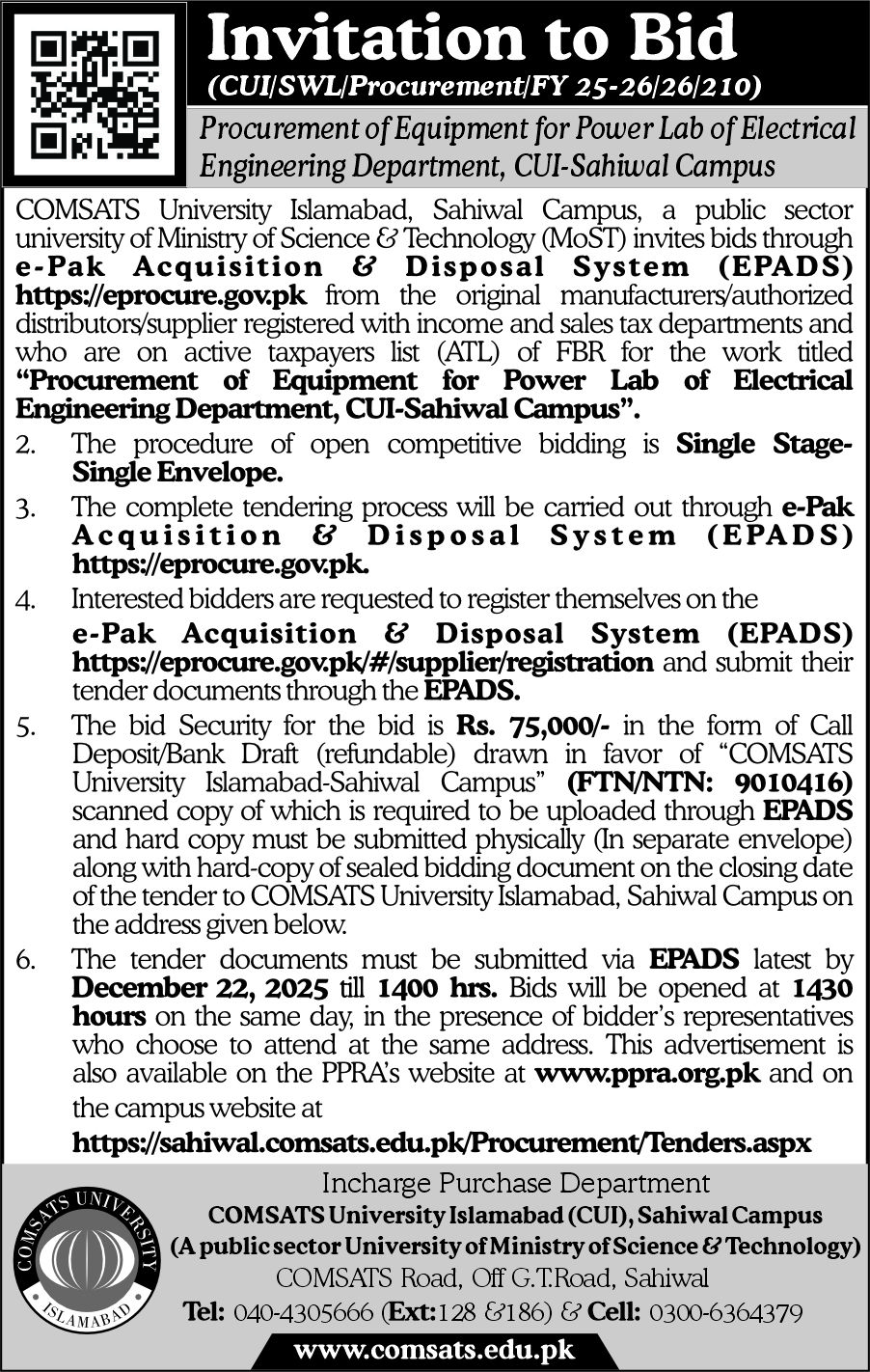 Invitation to bid for Procurement of Equipment for Power Lab of Electrical Engineering Department, CUI-Sahiwal Campus