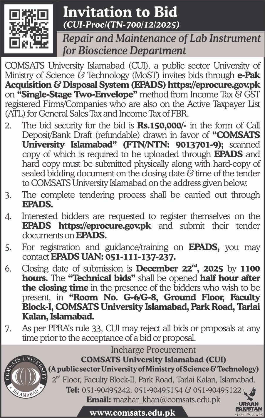 Invitation to Bid for Repair and Maintenance of Lab Instrument for Bioscience Department at CUI Islamabad Campus