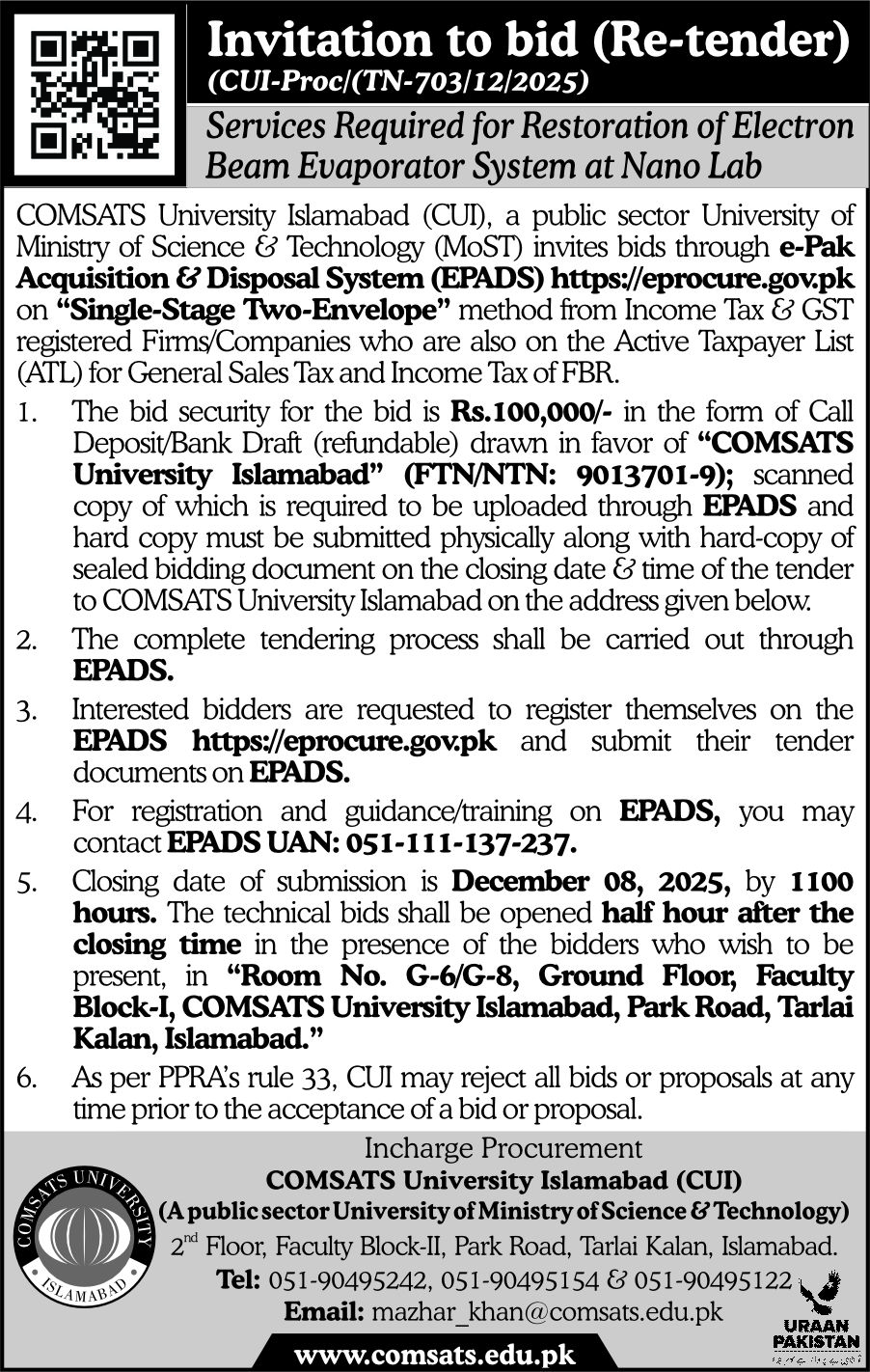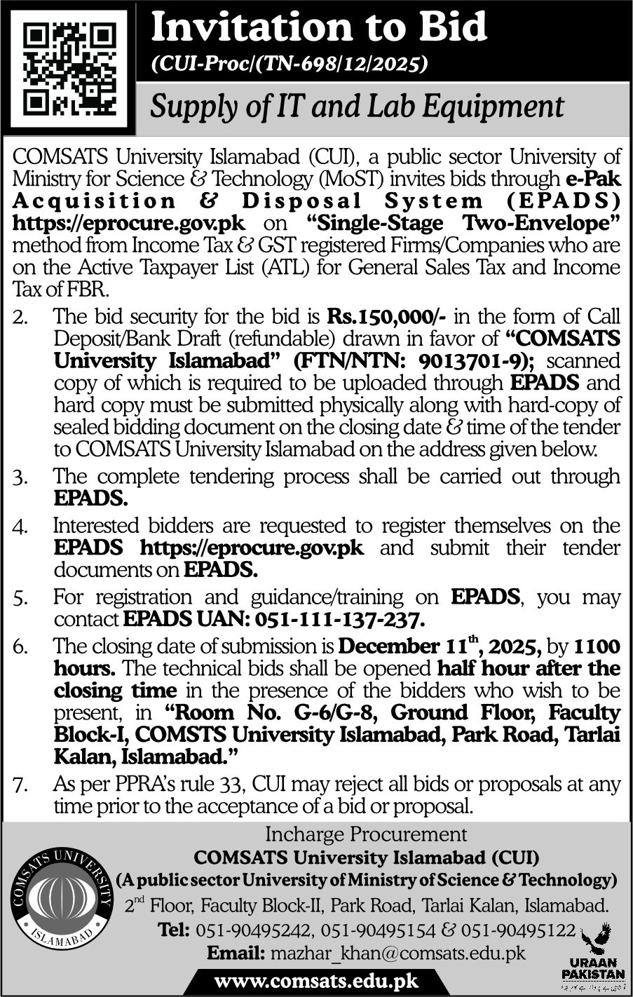 Invitation to Bid for Supply of IT and Lab Equipment (Dr. Ali Arshad) CUI Islamabad