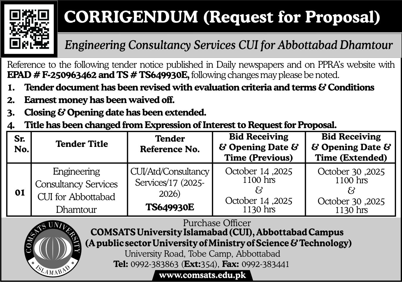 CORRIGENDUM RFP Engineering Consultancy Services CUI for Abbottabad (Dhamtour)