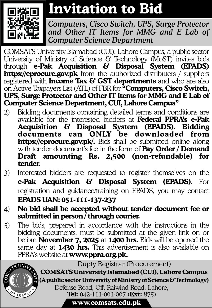 Invitation to Bid for Procurement of IT Items for Computer Labs, Classrooms at CUI Lahore Campus