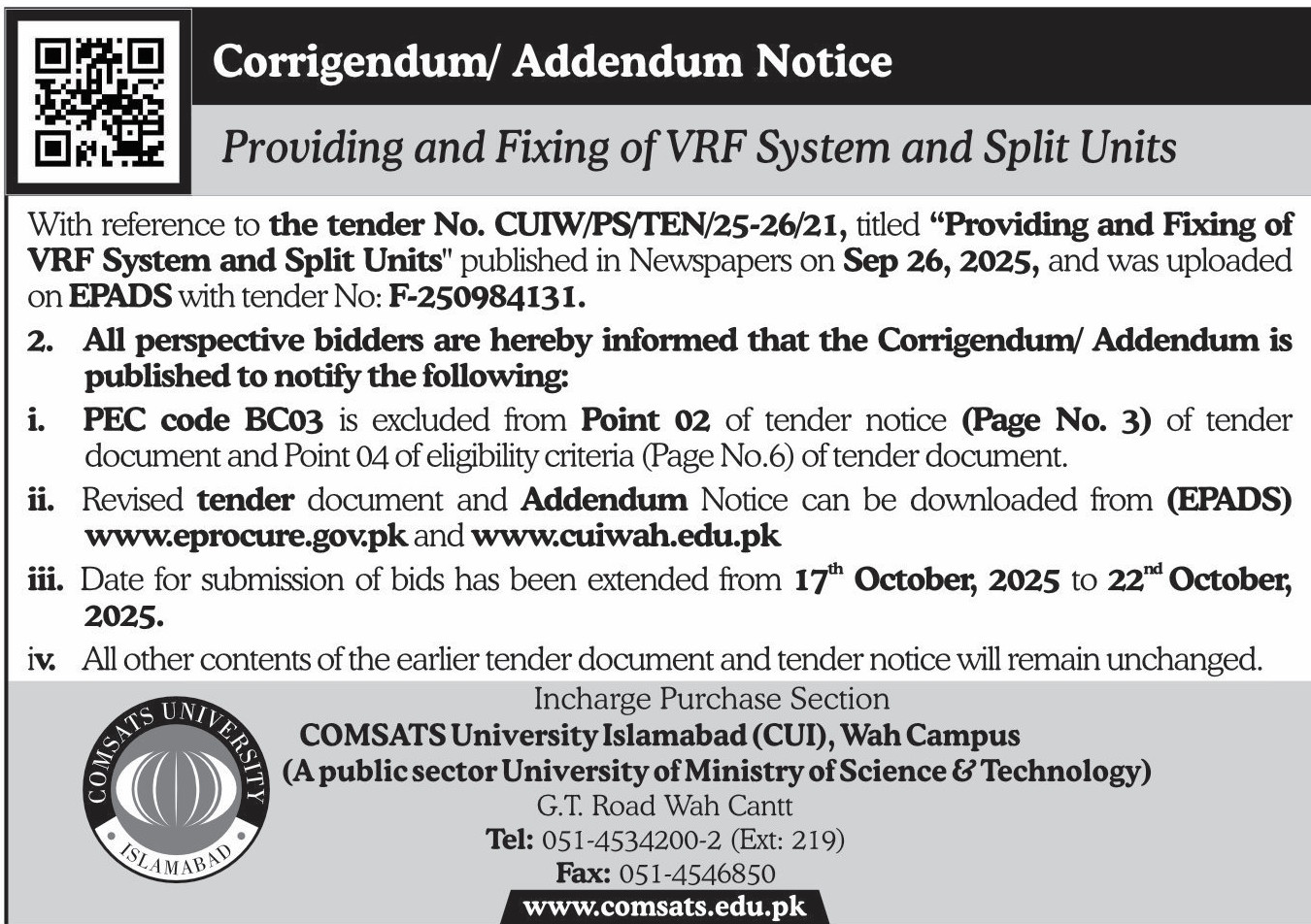 Corrigendum Addendum Notice for Providing and Fixing of VRF System and Split Units at CUI Wah Campus