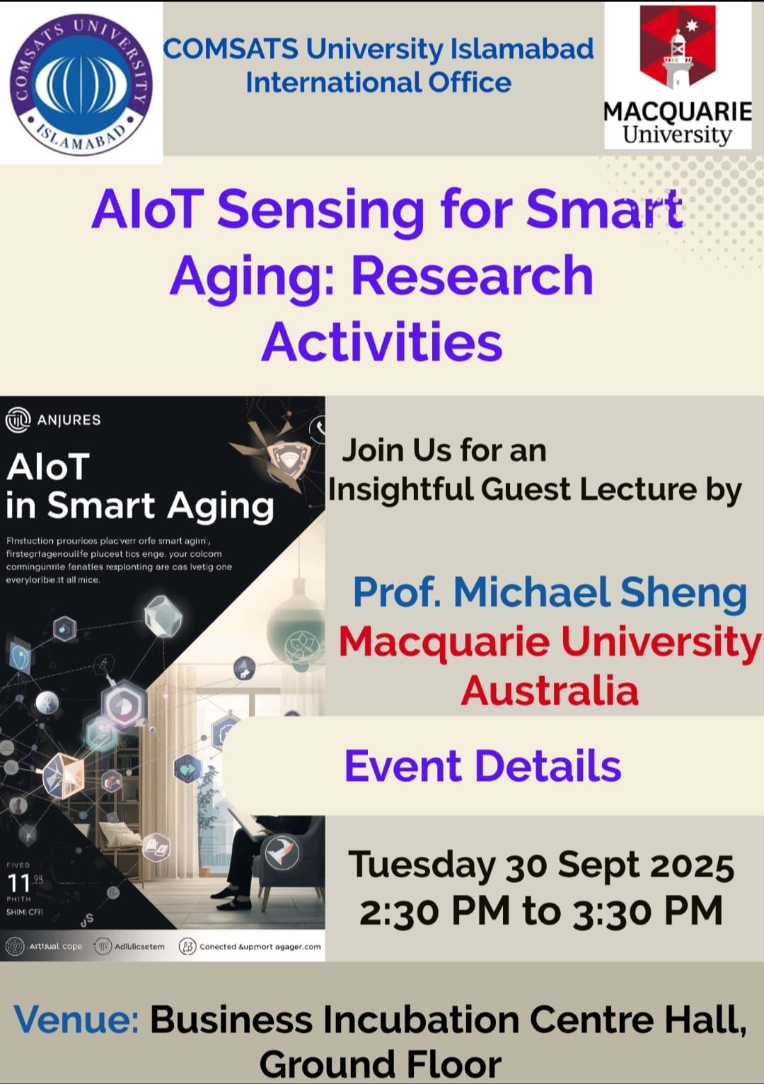 COMSATS University Islamabad (CUI) is pleased to host Prof. Michael Sheng (Macquarie University, Australia) for a public lecture titled “AIoT Sensing for Smart Aging: Research Activities and Future Directions.” The lecture will take place on 30 September 2025 from 02:30 PM to 03:30 PM at the Business Incubation Centre Hall (Ground Floor).