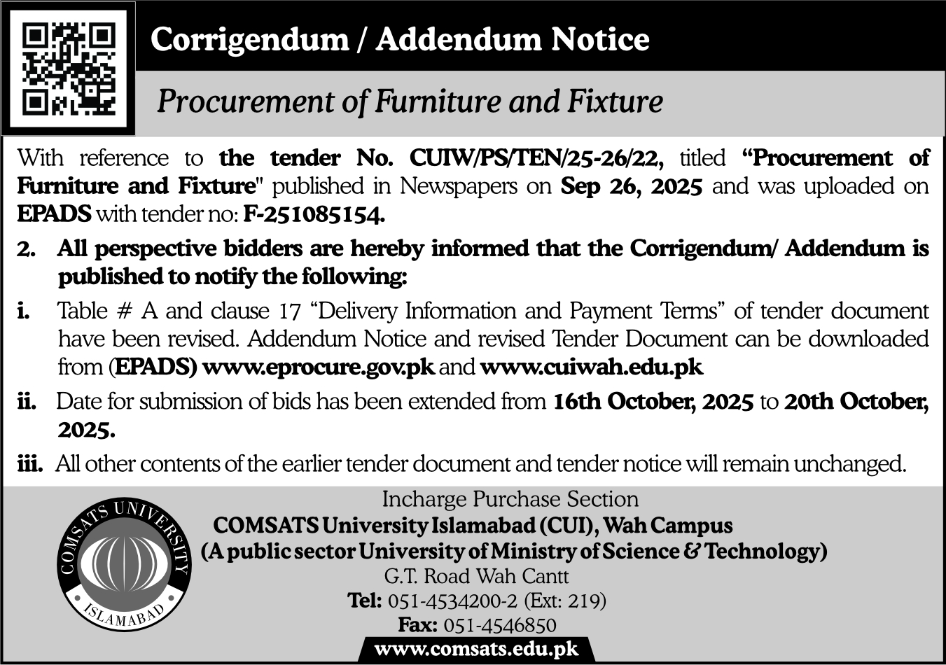 Corrigendum Addendum Notice Procurement of Furniture and Fixture at CUI Wah Campus