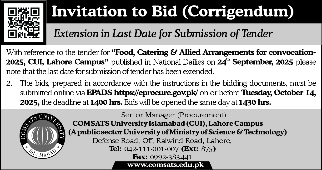 Invitation to Bid for Supply of Food and Other Arrangements for Convocation 2025 at CUI Wah Campus
