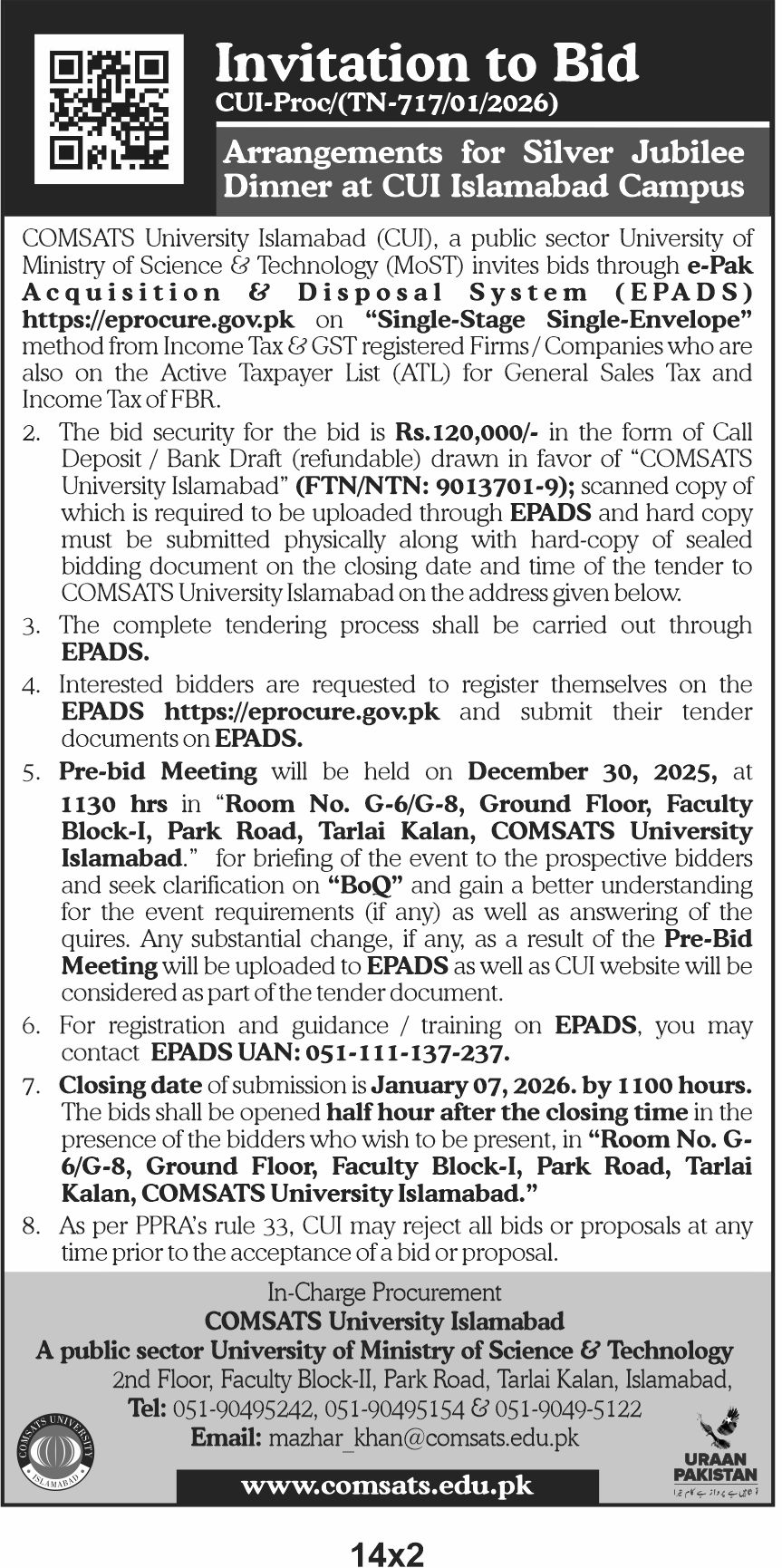 Invitation to Bid for Arrangements of Silver Jubilee Dinner at CUI Islamabad Campus