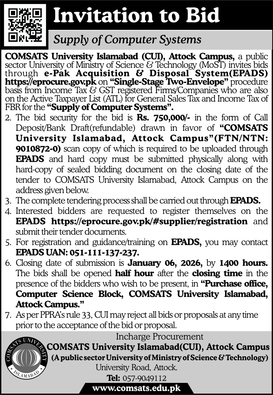 Invitation to Bid for Supply of Computer Systems at CUI Attock Campus
